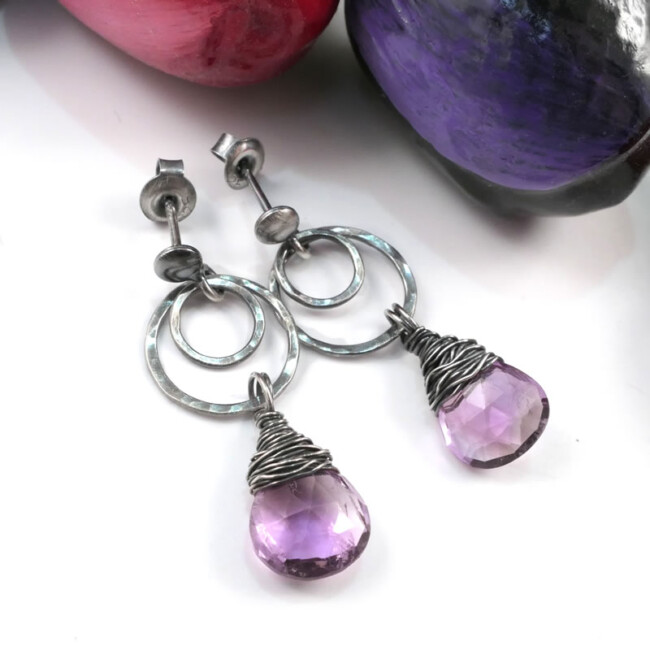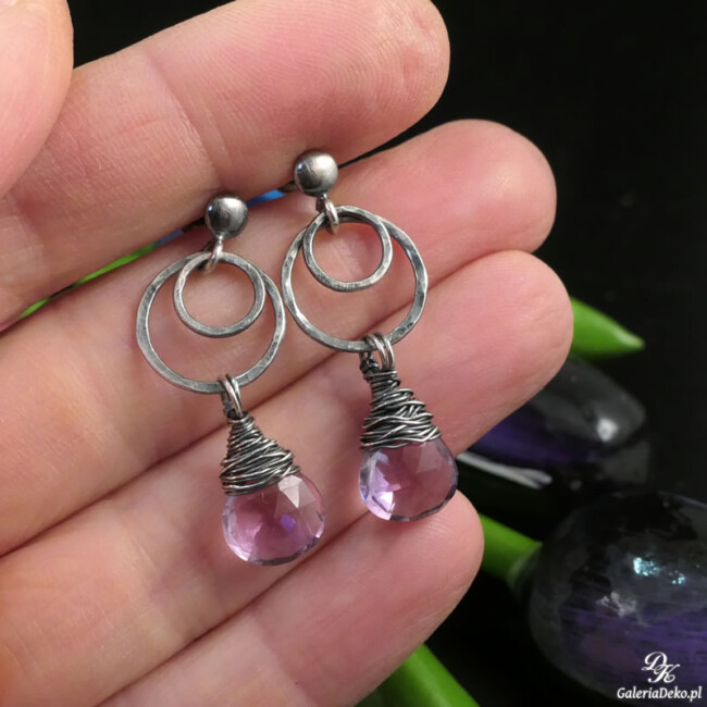 Delikatne kolczyki zostały wykonane z ok. 9mm fasetowanych kropelek lawendowego Ametystu, owiniętych srebrem i zawieszonych na srebrnych kółkach i sztyftach. Srebro oksydowane i wypolerowane. Kolczyki mają długość ok. 3,3cm.