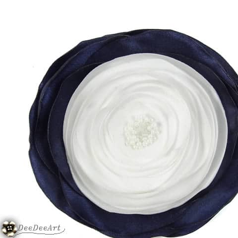 Broszka wykonana z satyny w białym i granatowym kolorze, drobnych szklanych koralików oraz przyszytego zapięcia broszkowego. Broszka ma średnicę ok. 9,5cm. Płatki zabezpieczone przed strzępieniem.