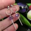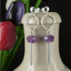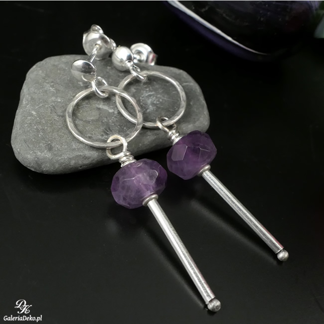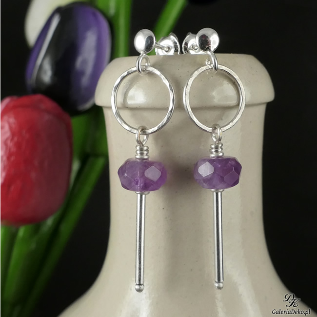 Nowoczesne kolczyki zostały wykonane z fasetowanych oponek Ametystu (8x5mm) oraz ze srebrnych elementów pr.925. Zawieszone na sztyftach. Kolczyki mają długość całkowitą 4cm. Na życzenie srebro można przyciemnić (zaoksydować).