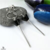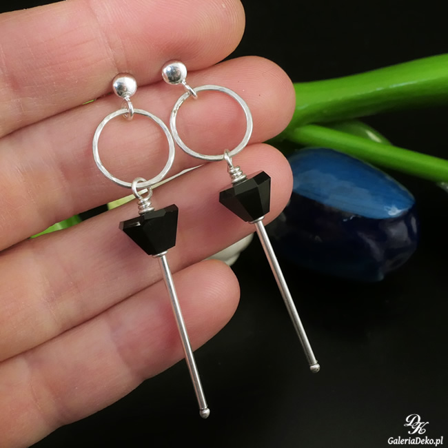 Nowoczesne kolczyki zostały wykonane z czarnego Spinelu o nietypowym szlifie (9x6mm) oraz ze srebrnych elementów pr.925. Zawieszone na sztyftach. Kolczyki mają długość całkowitą 5,5cm. Na życzenie srebro można przyciemnić (zaoksydować).