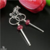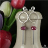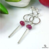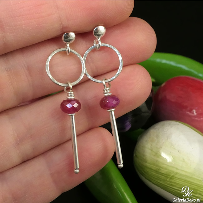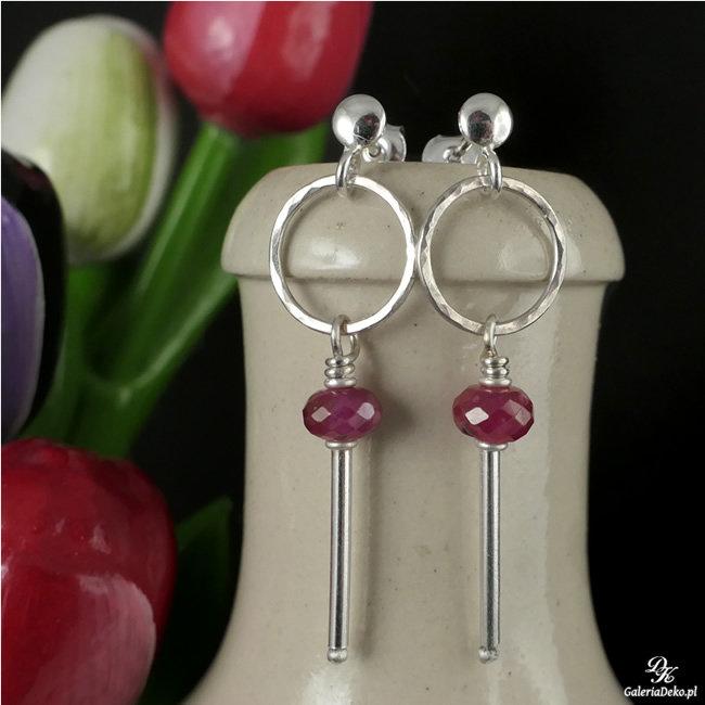 Nowoczesne kolczyki zostały wykonane z fasetowanych oponek Rubinu (6x4mm) oraz ze srebra pr.925. Zawieszone na sztyftach. Kolczyki mają długość całkowitą 4cm. Na życzenie srebro można przyciemnić (zaoksydować).