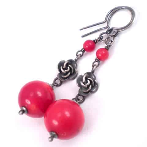 Kolczyki wykonane z 14mm i 4mm kul naturalnego Korala oraz srebrnych różyczek. Bigle srebrne. Całość oksydowana i wypolerowana.