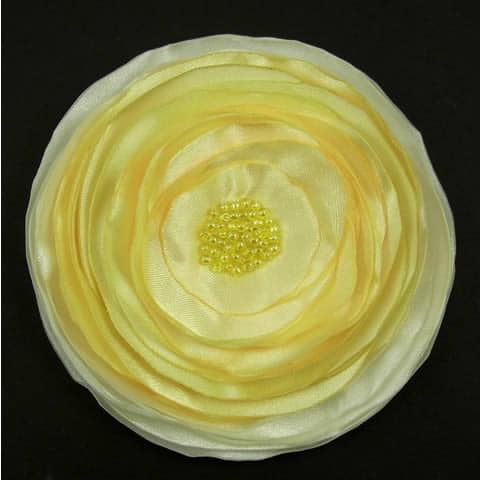 Broszka wykonana z satyny w kremowym i żółtym kolorze, drobnych szklanych koralików oraz przyszytego zapięcia broszkowego. Płatki zabezpieczone przed strzępieniem. Broszka ma średnicę ok. 9cm.