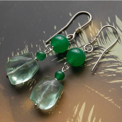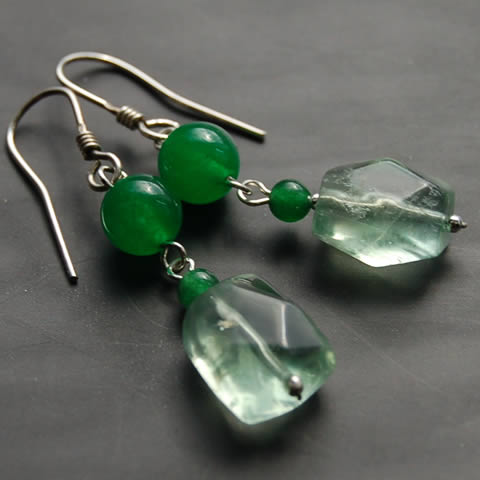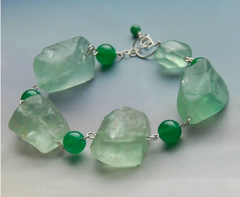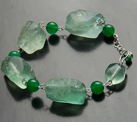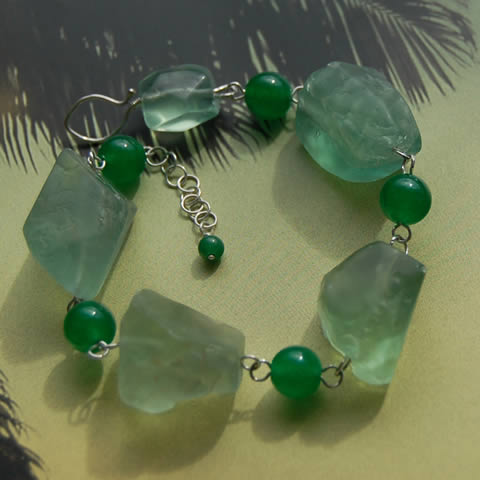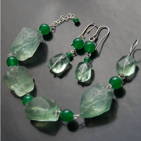 Zestaw biżuterii składający się z kolczyków i bransoletki został wykonany z surowych i szlifowanych brył Zielonego Fluorytu oraz kul Jadeitu. Bigle, zapięcie, łańcuszek i pozostałe elementy są z srebra pr. 925. Kolczyki mają długość ok. 5cm, bransoletka ma regulowaną długość ok. 20-22,5cm.