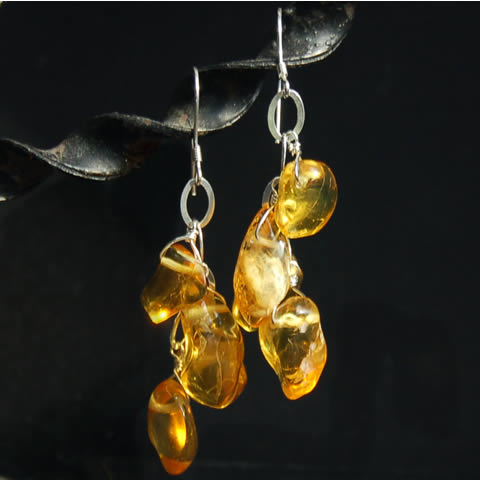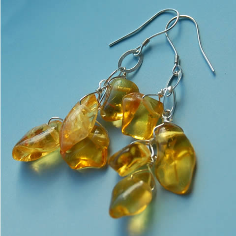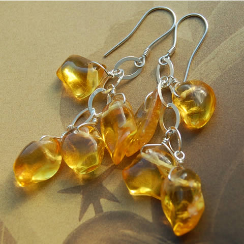 Kolczyki o pięknym słonecznym kolorze zostały wykonane z nieregularnych polerowanych bryłek Bursztynu zawieszonych na srebrnym łańcuszku. Bigle srebrne. Kolczyki mają długość ok. 6,5cm