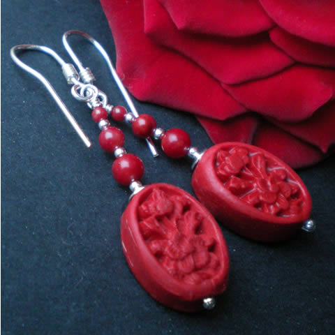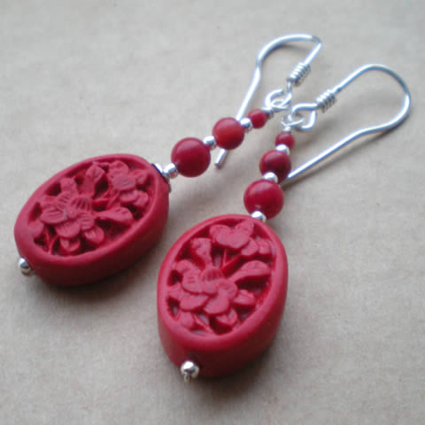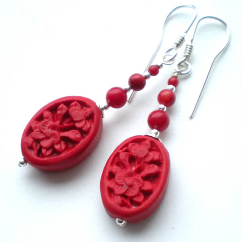 Oryginalne kolczyki wykonane z owalu Chińskiej Laki z wyrzeźbionym motywem kwiatów róży, małych kulek naturalnego Korala oraz srebrnych kuleczek. Bigle srebrne. Kolczyki mają długość całkowitą ok. 5,5cm.