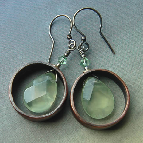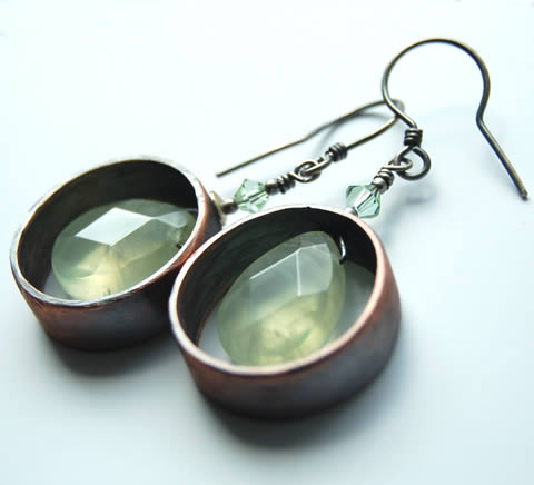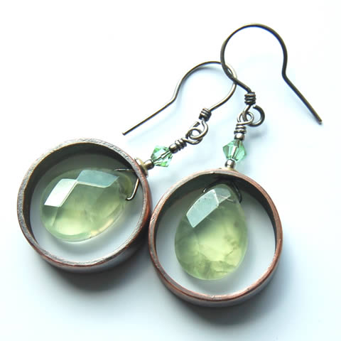 Oryginalne kolczyki wykonane z obręczy z oksydowanej miedzi, fasetowanych łezek naturalnego kamienia Prehnitu oraz kryształka Swarovski w kolorze Chrysolite. Bigle srebrne. Kolczyki mają długość ok. 5cm. Całość oksydowana i wypolerowana.