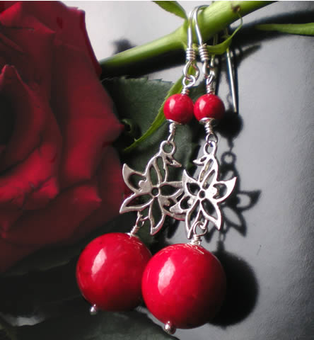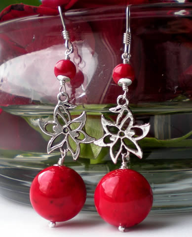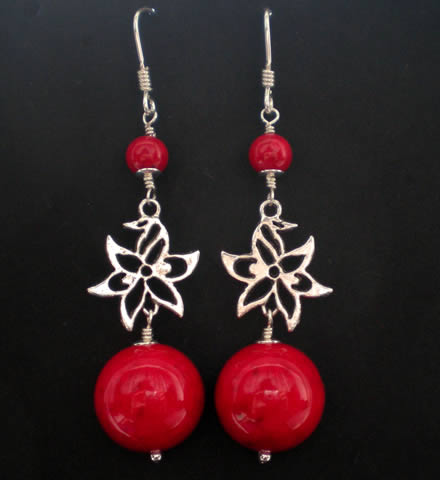 Letnie kolczyki wykonane z 6mm i 16mm kul koralowego Marmuru oraz przekładki w kształcie kwiatka. Bigle srebrne. Kolczyki mają długość całkowitą ok. 6,5cm.