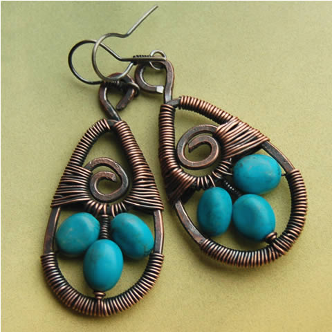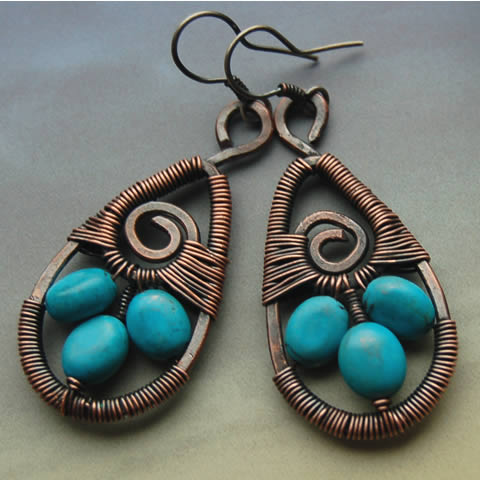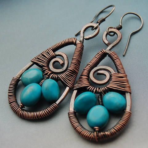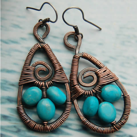 Etniczne kolczyki wykonane z oksydowanej miedzi, ręcznie zwijanej i młotkowanej, małych pastylek Howlitu Turkusowego oraz srebrnych oksydowanych bigli. Długość z biglami wynosi ok. 6,5cm.