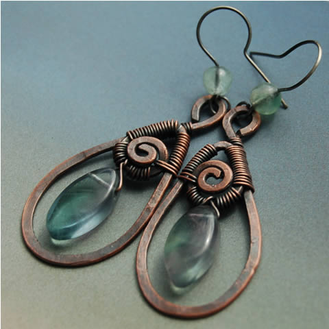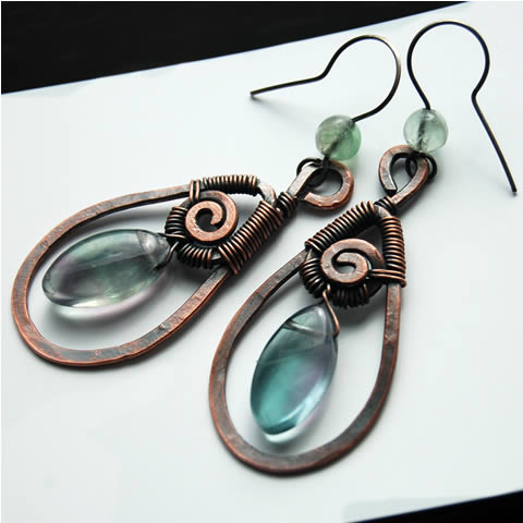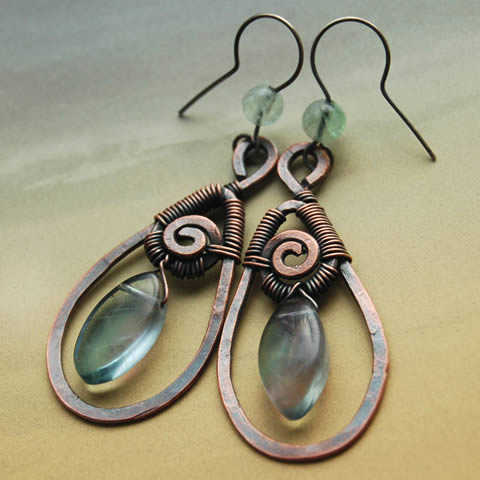 Etniczne kolczyki wykonane z oksydowanej miedzi, ręcznie zwijanej i młotkowanej, markizy Fluorytu oraz srebrnych oksydowanych bigli z kulką Fluorytu. Kolczyki mają długość ok. 7cm