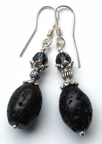 Kolczyk wykonane z kryształu round Swarovski w kolorze Morion, przekładek bali i beczułki Lawy wulkanicznej. Bigle srebrne.