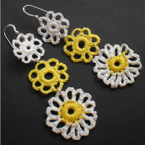 Kolczyki wykonane ręcznie na szydełku z żółtej i białej bawełny. Całość usztywniona i odporna na działanie wody. Bigle srebrne. Długość całkowita kolczyków wynosi ok. 8cm.