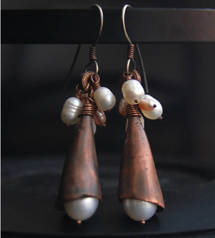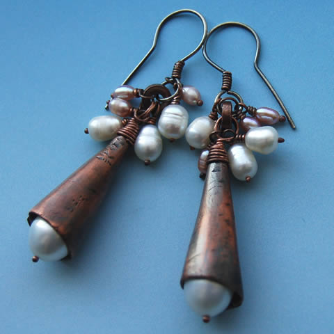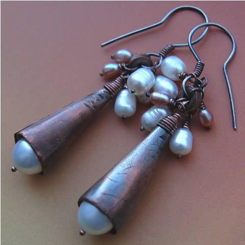Kolczyki wykonane z ręcznie kutej i zwijanej miedzianej blachy, krążka z miedzi, naturalnych białych pereł rzecznych wielkości 12x10mm oraz małych białych i różowych rzecznych pereł zawieszonych na miedzianych drucikach. Bigle srebrne. Całość oksydowana i wypolerowana. Kolczyki mają długość ok. 6,5cm.