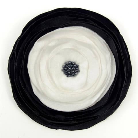 Broszka wykonana z satyny w białym i czarnym kolorze, drobnych szklanych koralików oraz przyszytego zapięcia broszkowego. Płatki zabezpieczone przed strzępieniem. Broszka ma średnicę ok. 9cm.