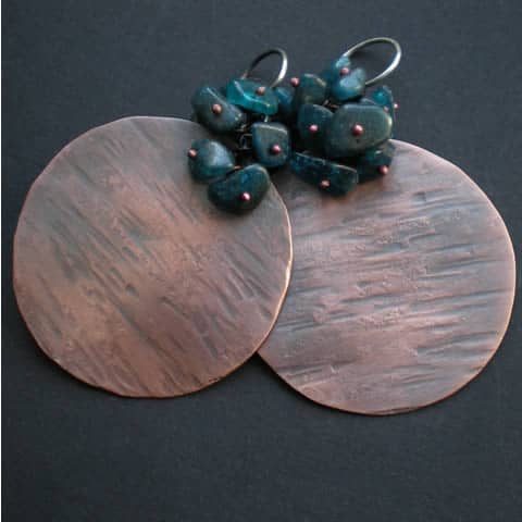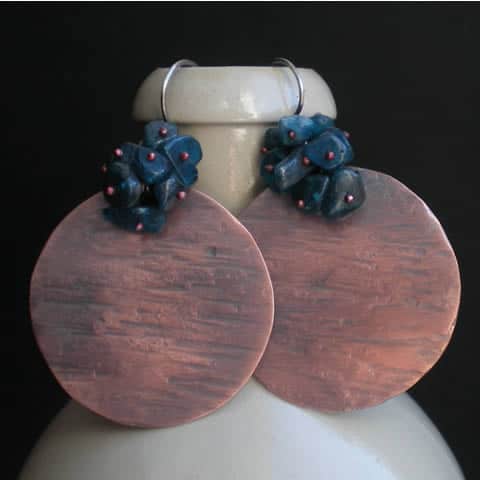 Etniczne, oryginalne kolczyki wykonane z ręcznie wycinanych i młotkowanych dla uzyskanie ciekawej faktury kół z miedzianej blachy w otoczeniu nieregularnych bryłek kamienia Apatytu zawieszonych na ręcznie topionych miedzianych szpilkach. Bigle srebrne z miedzianą sprężynką. Całość oksydowana i wytarta. Koła mają średnice ok. 3,7cm. Kolczyki mają długość ok. 6cm.