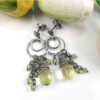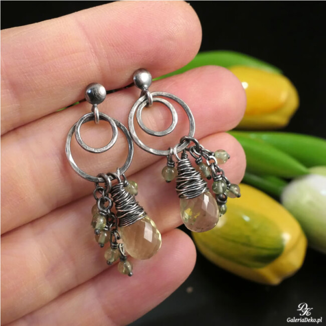 Wyjątkowe kolczyki zostały wykonane z ok. 12mm kropelek Kwarcu Lemon, owiniętych srebrem oraz srebrnych łańcuszków i 3mm kulek Oliwinu, zawieszonych na młotkowanych kółkach. Srebro oksydowane i wypolerowane. Kolczyki mają długość ok.3,5cm.