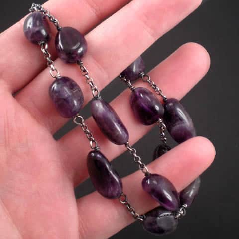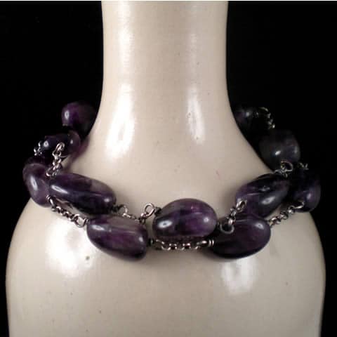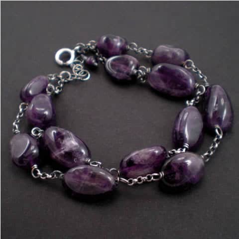 Podwójna bransoletka została wykonana z nieregularnych, gładkich bryłek naturalnego Ametystu o pięknym ciemnym kolorze zawieszonych na srebrnych łańcuszkach typu rollo. Srebrne zapięcie typu federing. Całość oksydowana i wypolerowana. Bransoletka ma długość regulowaną ok. 19,5 -22cm.
