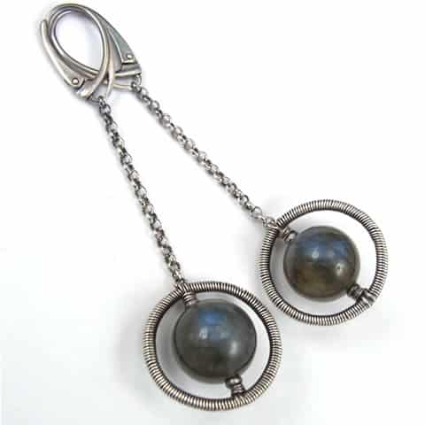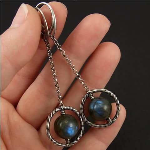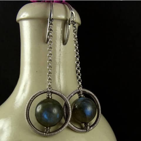 Oryginalne kolczyki zostały wykonane z 12mm kulek Labradorytu o pięknym niebieskim ogniu oprawionych w koła oplecione srebrem techniką wire-wrapping i zawieszonych na srebrnym łańcuszku typu rollo. Bigle angielskie srebrne. Kolczyki mają długość ok. 7cm. Srebro oksydowane i wypolerowane.