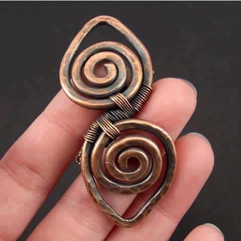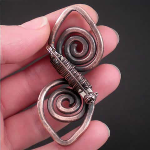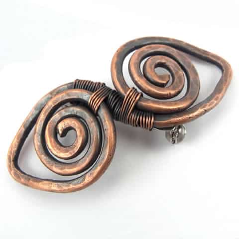 Broszka wykonana z ręcznie wyginanego i młotkowanego miedzianego drutu oraz zapięcia broszkowego. Całość oksydowana i polerowana. Broszka ma wymiary 6cm x 2,5cm.