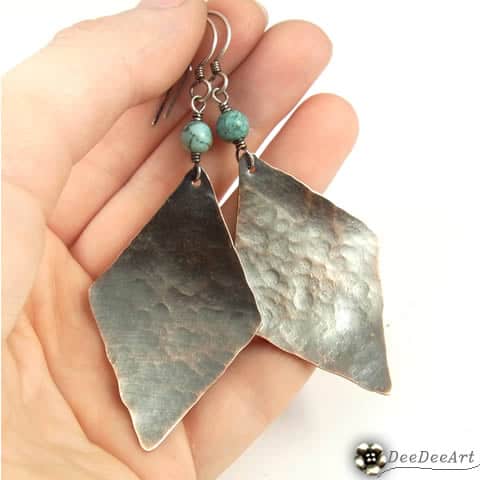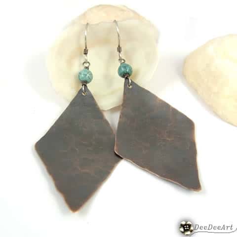 Etniczne kolczyki wykonane z ręcznie wycinanych, wygiętych i repusowanych dla uzyskanie ciekawej faktury rombów z miedzianej blachy oraz 6mm kulek Howlitu. Bigle srebrne z miedzianą sprężynką. Całość oksydowana i wypolerowana. Kolczyki mają długość ok. 8cm, w najszerszym miejscu mają ok. 3cm.