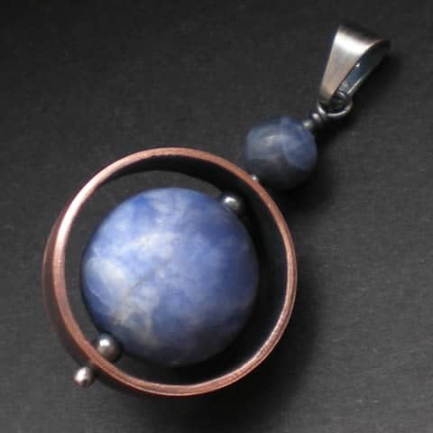 Wisiorek wykonany z 16mm i 6mm kulki Sodalitu oraz obręczy z miedzi. Krawatka jest srebrna. Wisiorek ma długość ok 4cm. Całość oksydowana i wypolerowana.