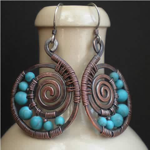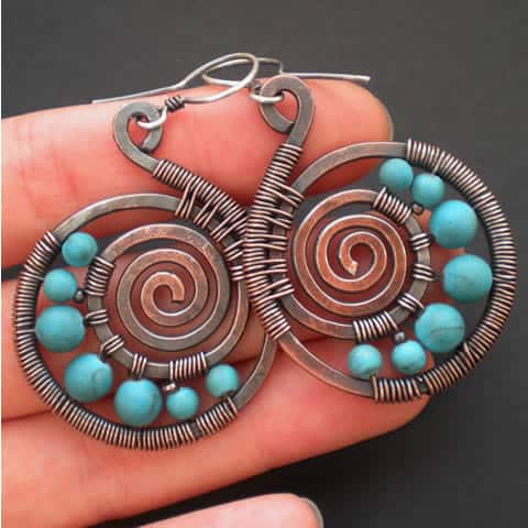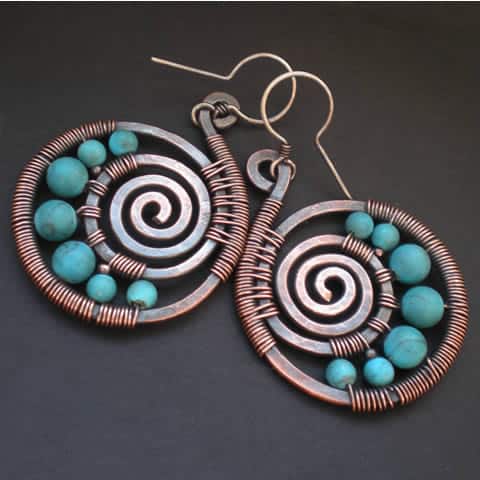 Etniczne kolczyki wykonane z oksydowanej miedzi, ręcznie zwijanej i młotkowanej, 6mm i 4mm kulek Turkmenitu oraz srebrnych oksydowanych bigli ze sprężynką z miedzi. Kolczyki mają długość ok 5,5cm, koło ma średnicę ponad 3cm.