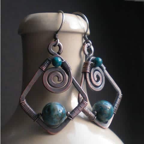 Etniczne kolczyki wykonane z oksydowanej miedzi, ręcznie zwijanej i młotkowanej, 10mm kulek Agatu Larimar o naturalnej chropowatej powierzchni, 4mm kulek Chryzokoli oraz srebrnych oksydowanych bigli ze sprężynką z miedzi. Kolczyki mają długość ok 5,5cm.