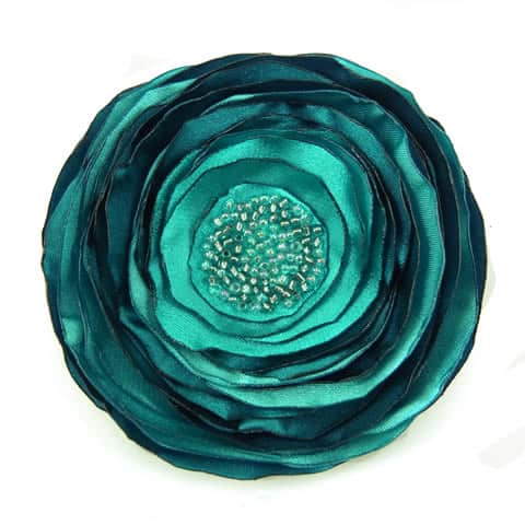 Broszka wykonana z satyny o morskim kolorze, drobnych szklanych koralików oraz przyszytego zapięcia broszkowego. Płatki zabezpieczone przed strzępieniem. Średnica broszki to ok. 8cm.