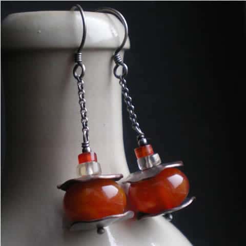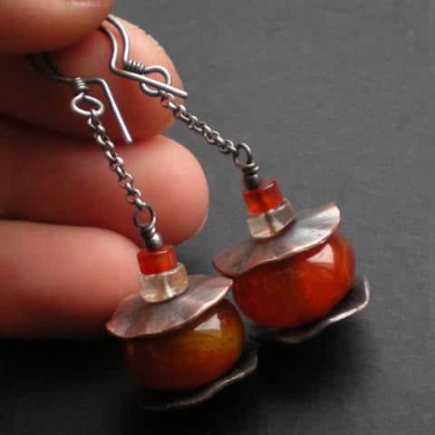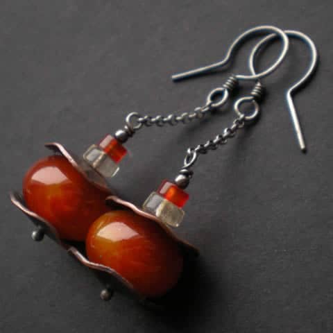 Wyjątkowo oryginalne kolczyki zostały wykonane z oponek Agatu o pomarańczowo-żółtym kolorze oprawionych w pofalowane krążki z miedzi oraz z oponek Cytrynu i Karneolu zawieszonych na srebrnym łańcuszku typu rollo. Bigle srebrne. Kolczyki mają długość ok. 5cm. Całość oksydowana i wypolerowana.