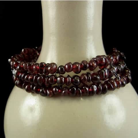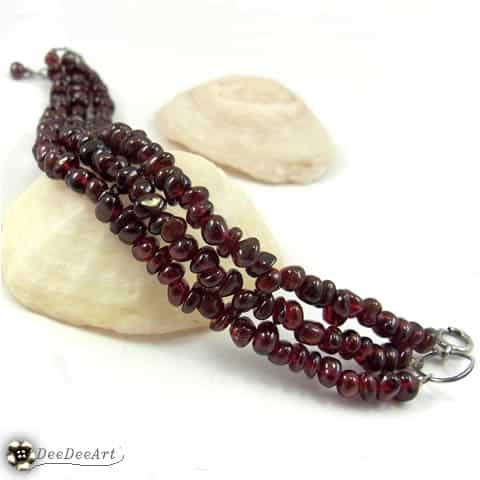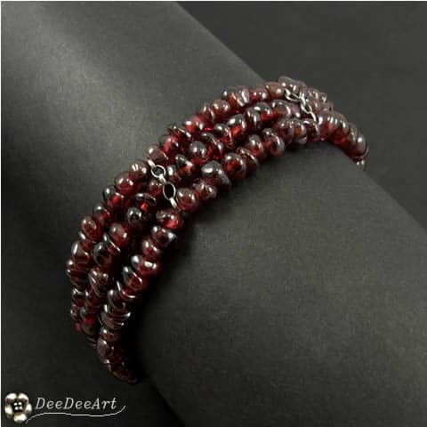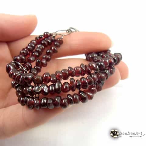 Delikatna, trzyrzędowa bransoletka została wykonana z ok. 5mm nieregularnych bryłek naturalnego Granatu, nanizanych na stalową linkę jubilerską i połączonych ze sobą srebrnymi łańcuszkami. Zapięcie srebrne typu federing. Całość oksydowana i wypolerowana. Bransoletka ma długość regulowaną ok. 18-20cm.