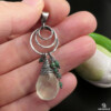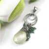 Wyjątkowy wisiorek został wykonany z ok. 17mm szlifowanej kropli Prehnitu owiniętej srebrem w otoczeniu łańcuszka z 2mm kulkami zielonego Onyksu, zawieszonych na młotkowanych kółkach. Srebro oksydowane i wypolerowane. Wisiorek ma długość ok.4,5cm.