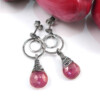 Delikatne kolczyki zostały wykonane z ok. 11mm pięknie szlifowanych kropelek naturalnego, niebarwionego Rubinu, owiniętych srebrem i zawieszonych na srebrnych młotkowanych kółkach i sztyftach. Srebro oksydowane i wypolerowane. Kolczyki mają długość ok. 3,4cm.