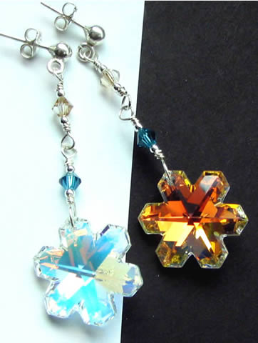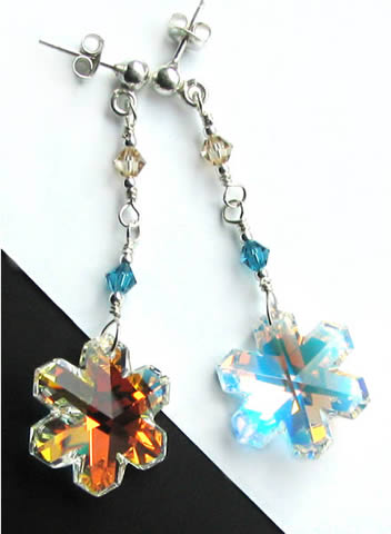 SnowflakesKolczyki wykonane z kryształów Swarovski w kształcie płatków śniegu w kolorze Crystal ABSnowflakes (Aurora Borealis) i małych kryształków bicone Swarovski w kolorze golden shadow(4mm) i indicolite(4mm). Sztyfty są srebrne.