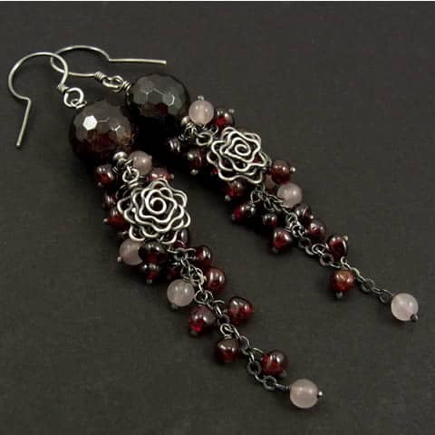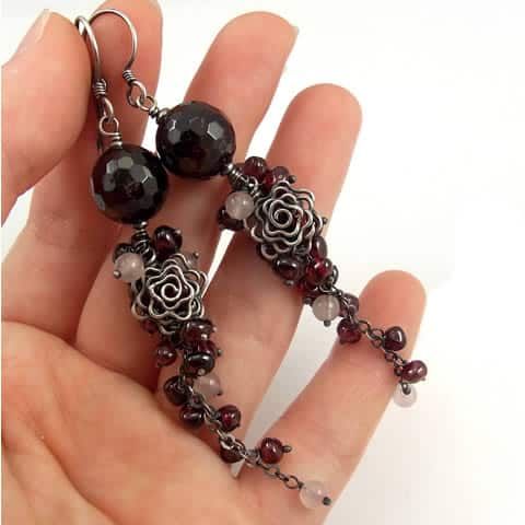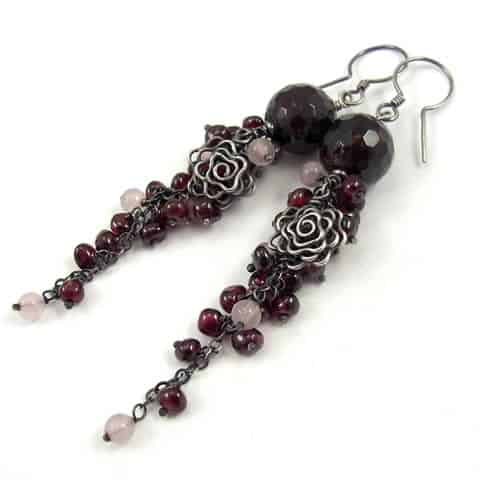 Wyjątkowe i efektowne kolczyki wykonane z 12mm fasetowanych kul naturalnego Granatu, srebrnych ręcznie wykonanych róż, 4mm kulek Kwarcu różowego i nieregularnych bryłek Granatu zawieszonych na ręcznie topionych srebrnych szpilkach w kształt wiszącego gronka. Bigle srebrne. Całość oksydowana i wypolerowana. Kolczyki mają długość ok. 9cm, jeden kolczyk waży ok. 10 gram.