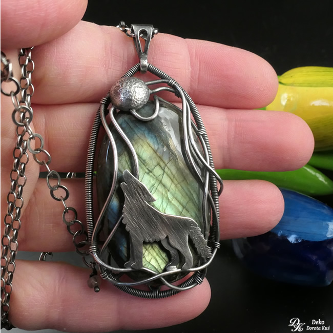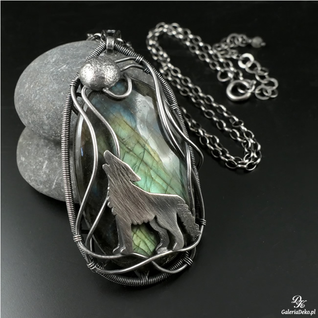 Oryginalny, dwustronny naszyjnik inspirowany dziką przyrodą, został wykonany w całości ze srebra i naturalnego Labradorytu o mocnym żółto-zielonym ogniu z niebieską obwódką. Wilk został ręcznie wycięty ze srebrnej blachy pr.925, księżycowi dodatkowo nadałam surową fakturę. Na drugiej stronie wisiora znajduje się wizerunek wyjącego wilka, uformowany ze srebrnego drutu.