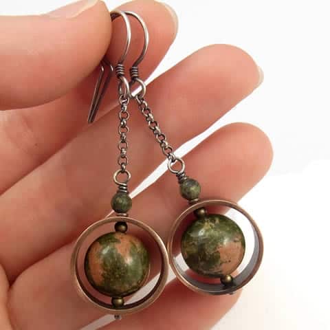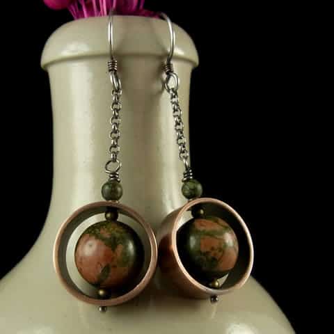 Oryginalne kolczyki wykonane z 4mm kulek Jaspisu i 12mm kul ciekawie wybarwionego Unakitu oprawionych w ręcznie formowane obręcze z miedzi i zawieszonych na srebrnych łańcuszkach. Bigle srebrne ze sprężynką z miedzi. Całość oksydowana i wypolerowana. Kolczyki mają długość ok. 6cm. Istnieje możliwość wykonania bransoletki.