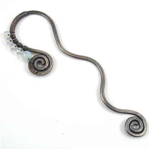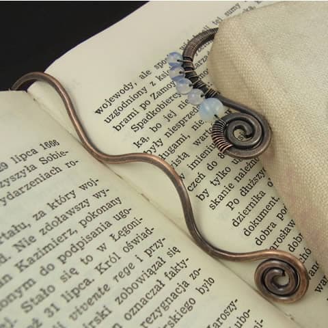 Zakładka do książki wykonana z oksydowanej miedzi ręcznie zwijanej i młotkowanej oraz z 6mm i 4mm kuleczek Opalitu. Długość zakładki to ok. 10cm.