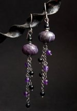 Oryginalne kolczyki wykonane z 14mm oponek kamienia Czaroitu, srebrnych talerzyków i 4mm kulek Onyksu i Jadeitu ametystowego zawieszonych na srebrnym łańcuszku. Bigle srebrne. Całość oksydowana i wypolerowana. Kolczyki mają długość ok. 8cm.
