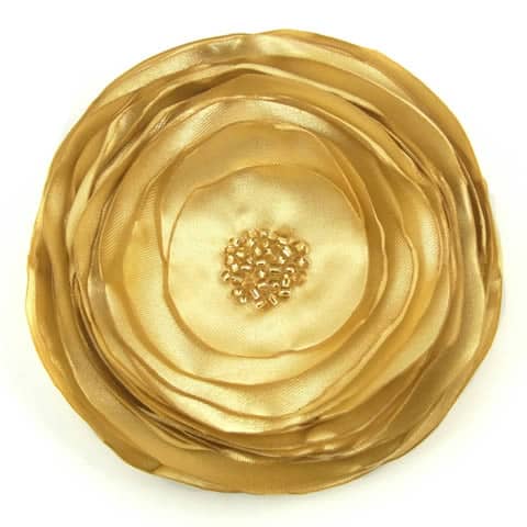 Broszka wykonana z satyny w złotym kolorze, drobnych szklanych koralików oraz przyszytego zapięcia broszkowego. Płatki zabezpieczone przed strzępieniem. Broszka ma średnicę ok. 8cm.