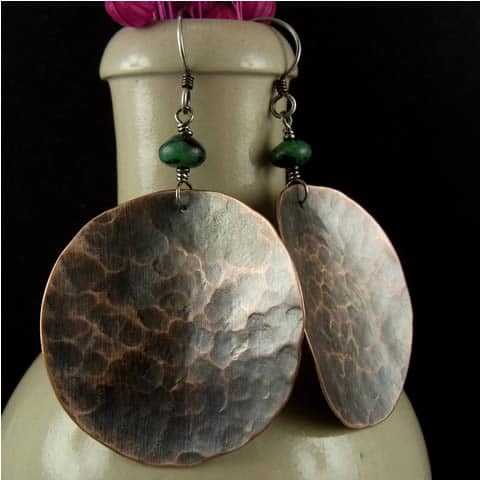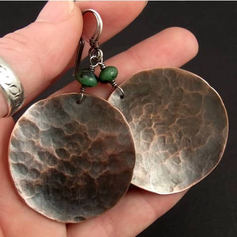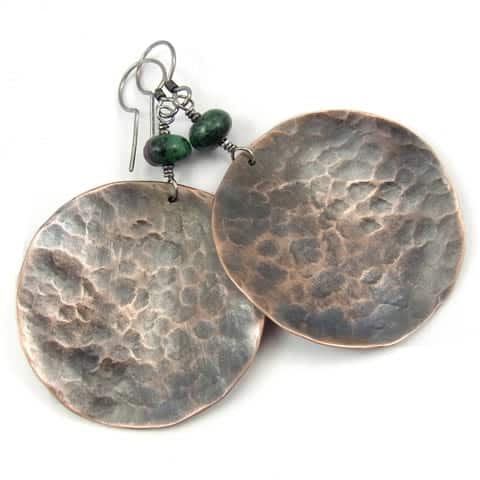 Etniczne, oryginalne kolczyki wykonane z ręcznie wycinanych, wygiętych i repusowanych dla uzyskanie ciekawej faktury kół z miedzianej blachy oraz oponek naturalnego Zoisytu. Bigle srebrne z miedzianą sprężynką. Całość oksydowana i wypolerowana. Koła mają średnicę ok. 4cm. Kolczyki mają długość ok. 7cm.